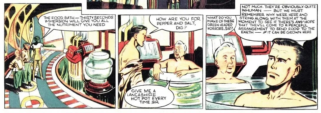 Est-il absolument impossible d’envisager que l’homme soit voué à semblable évolution ; d’imaginer qu’il ne se nourrira plus, au milieu de tout cet attirail encombrant de serveurs et de plats, d’aliments déformés à la teinte étrange, mais qu’il s’alimentera avec une élégante simplicité en s’immergeant dans un baquet empli d’un liquide nutritif ? – H.G. Wells, Of a Book Unwritten: The Man of the Year Million (1893)
